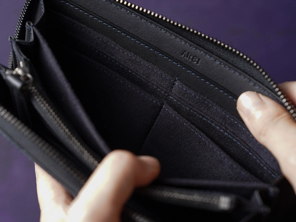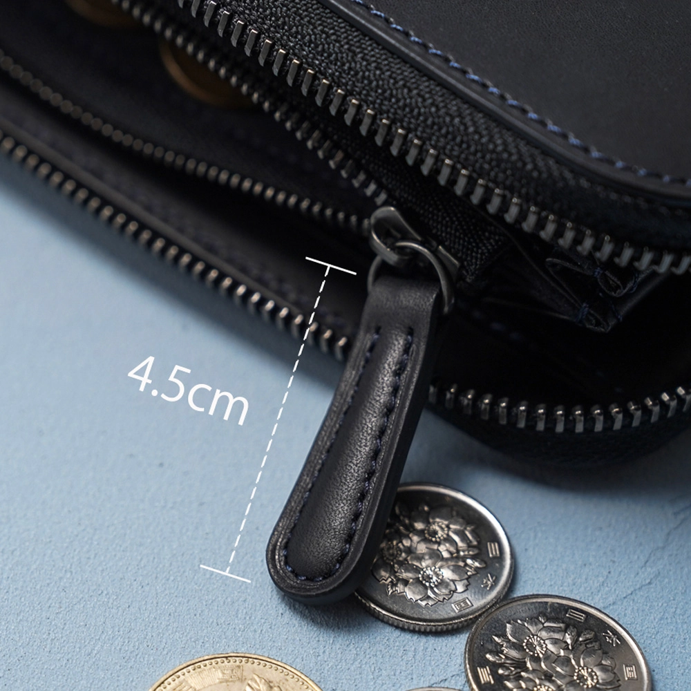 小銭入れの引き手は少し大きめに設計されている。実は小銭入れの引き手が小さいと移動中に財布の中で動いてしまう。これが外ファスナーを開ける際に変にひっかかり、破損に繋がりやすい。そのためにAlt81では通常よりあえて大きめに設計。閉める際に内側に仕舞うクセを付ける必要はあるが、小さな引き手と比べると使いやすさと壊れにくさは明らかに違う。何よりも高級感がある。