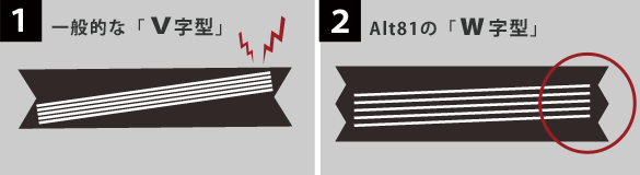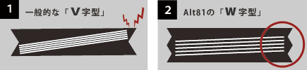 快適な使用感を得るために内装のササマチにもこだわりが。実は一般的な名刺入れのササマチよりも折りが一つ多い作りになっている。通常の折りはマチがV字型(※図①)になり、名刺を出し入れする際に内側に折り畳まれた部分にひっかかったり、名刺を収めるときにななめになってしまうことがある。これらの減少を軽減させるために折りを一つ多くするW字型(※図②)のマチを生み出した。また、折り込むためには革を漉く必要があるのだがシールドショルダーレザーの強度が保てるレベルを追求し、結果ササマチの折りが美しく納まっている。製作する際の職人の手間が増えるものの使用感に違いが生まれるために取り入れたAlt81の工夫。使うほどに納得してもらえるだろう。