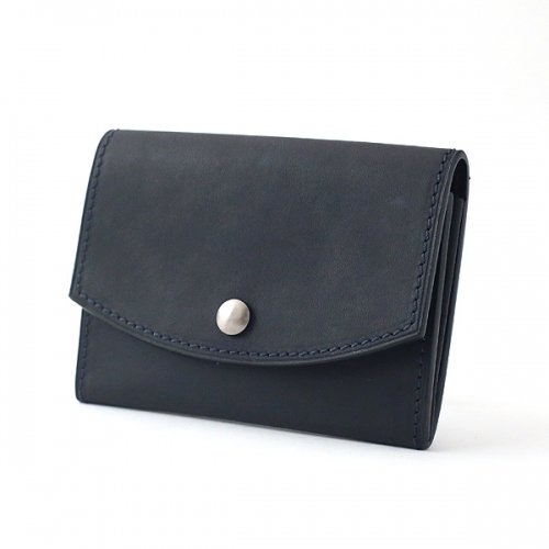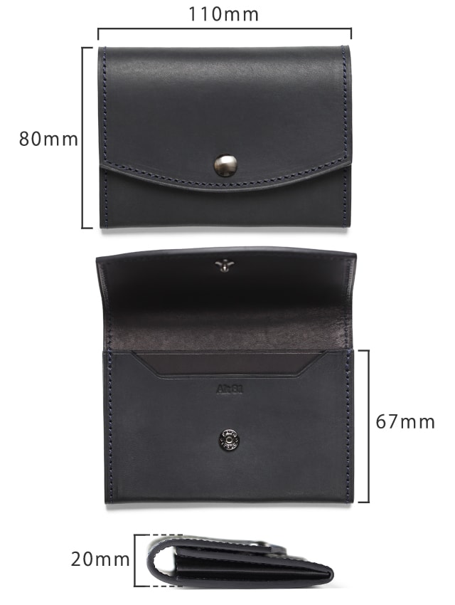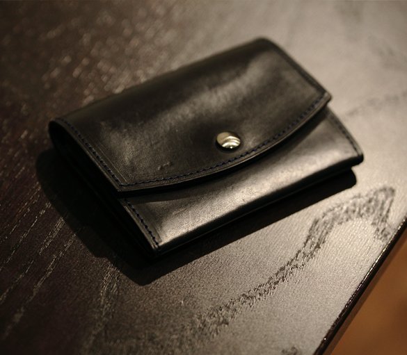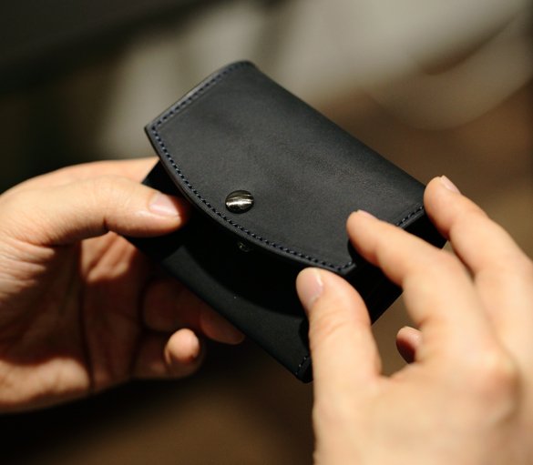 名刺入れはビジネスで最も使い込まれるアイテムの一つ。シールドショルダーレザーのようなタフな革とは相性が頗る良い。そもそもこの革は非常に厚くそのままでは折り曲げるのも困難。そこでこの革をあえて少し漉くことで名刺入れに採用出来るようにした。当然、漉いても革の繊維密度が変わるわけではないので引き締まった銀面(革の表面)は漉く前と同様の存在感を放つ。またオイルを含んでいるこの革は使い続けることで当初のマットな質感が艶のあるものへと、色も少し白みを帯びた黒から漆黒へと変化。濃紺の糸色は当初はあまり目立たないが、漆黒に変化した革には強いアクセントとなり使用前を知る持ち主を必ず楽しませてくれる。