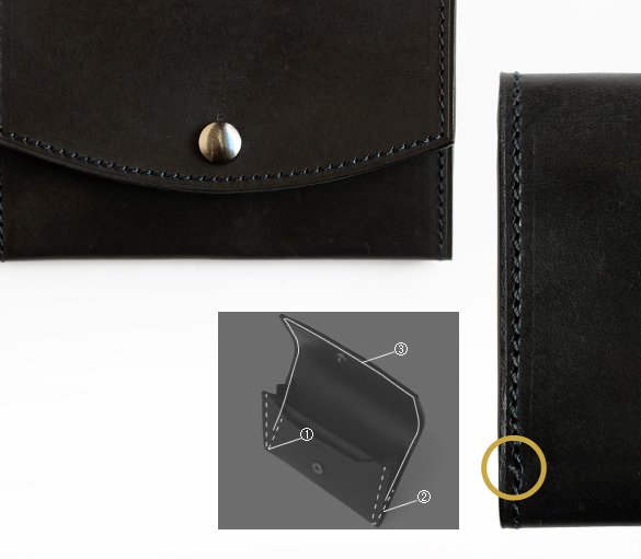 通常の折りはマチがV字型(※図①)になり、名刺を出し入れする際に内側に折り畳まれた部分にひっかかったり、名刺を収めるときにななめになってしまうことがある。これらの減少を軽減させるために折りを一つ多くするW字型(※図②)のマチを生み出した。また、折り込むためには革を漉く必要があるのだがシールドショルダーレザーの強度が保てるレベルを追求し、結果ササマチの折りが美しく納まっている。製作する際の職人の手間が増えるものの使用感に違いが生まれるために取り入れたAlt81の工夫。使うほどに納得してもらえるだろう。