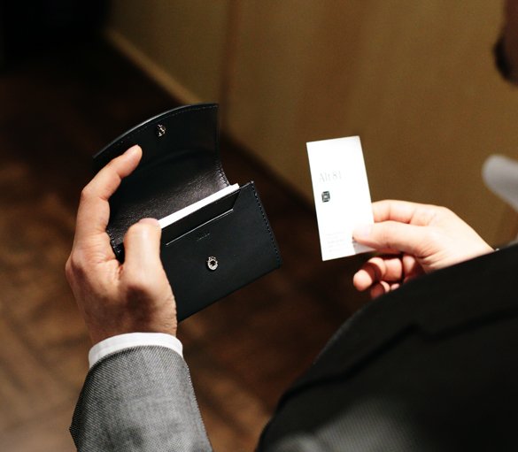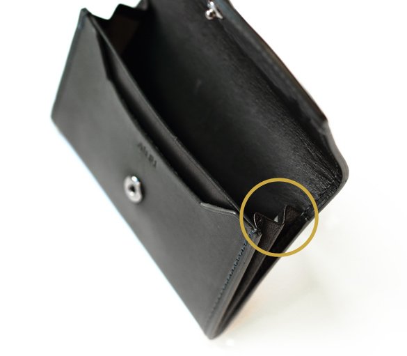 カブセに印象的な曲線があしらわれているのは相手の記憶に自分の存在を残すため。あまり見かけないこの形は横から見ていただくと分かるが革で名刺を一周半、グルッと包んでいる。実はこの一周半のミシン掛けは難しい。背面を見ると中心より少し下にミシン目をそろえて縫製している部分がある。これが前段を縫う出発点であり、中のササマチを縫う出発点でもある。 まず、左右合わせて2回、前段に向かってぐるっとミシンを掛ける。次に片側の出発点と同じ場所から逆方向に縫製し、そのままカブセの曲線を通過してもう一方の出発点まで縫う。つまり1回のミシンで済んでいるように見えて実は計3回掛けているのだ。ステッチが二重に掛かる箇所には一度掛けた針穴を狙って上から縫製を施す。そして、カブセの曲線は勿論、アクセントをつけるためだけではない。指のかかりをよくして名刺入れを開閉しやすくする意図がある。名刺交換をする際にはもたつかない事も重要だ。