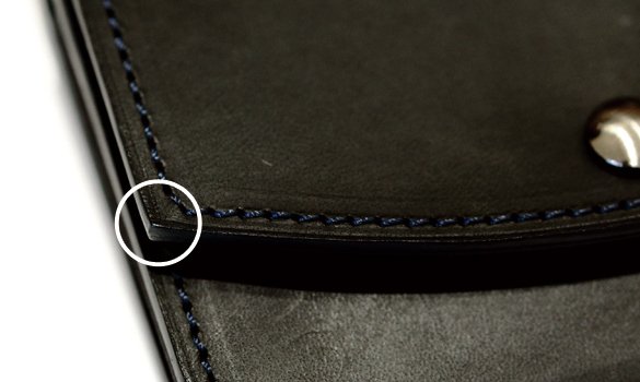 まず、左右合わせて2回、前段に向かってぐるっとミシンを掛ける。次に片側の出発点と同じ場所から逆方向に縫製し、そのままカブセの曲線を通過してもう一方の出発点まで縫う。つまり1回のミシンで済んでいるように見えて実は計3回掛けているのだ。ステッチが二重に掛かる箇所には一度掛けた針穴を狙って上から縫製を施す。そして、カブセの曲線は勿論、アクセントをつけるためだけではない。指のかかりをよくして名刺入れを開閉しやすくする意図がある。名刺交換をする際にはもたつかない事も重要だ。