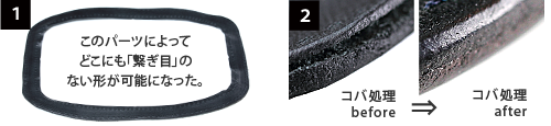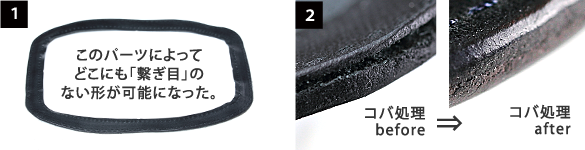 Alt81が特にこだわったのが2つの「継ぎ目」を無くしたところ。まず1つめは通常の作りでは主役のステマチに発生してしまう「継ぎ目」。これは贅沢にも中心をくり貫いたパーツを使用することで解決させた。ステマチを作ると発生する継ぎ目は目立たないところにもっていくのが一般的だが、ペンケースという商品の特性上、どこに配置しても目立ってしまう。贅沢にも大胆に、この中心をくり貫いたパーツを使うことでどこにも継ぎ目が現れない形を実現させた(※写真下①)。もう1つの「継ぎ目」はこの中心をくり貫いたパーツと表版の革を貼り合わせた断面(コバ面)のこと。このコバ面を何度もペーパー掛けを行い丁寧なコバ処理を施し、貼り合わせた時に出る継ぎ目を無くした(※写真下②)。ペンケースという人の目にも、自分の目にも触れやすいものだからこそ、細かいところにこだわった。