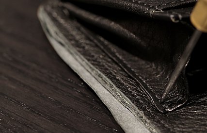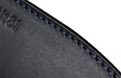 表版には引き締まった印象を持たせるため、太めのネン(縁に施すライン)を入れている。革の厚みやオイルの含み具合によって力加減が異なるネン引きは非常に難しい。極めて細かい箇所ではあるが、ネンが引いてあるのとないのとでは第一印象に違いが出る。