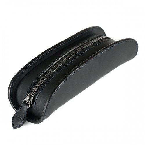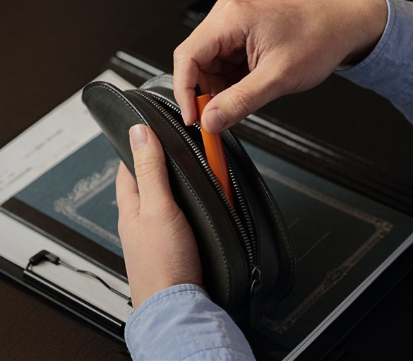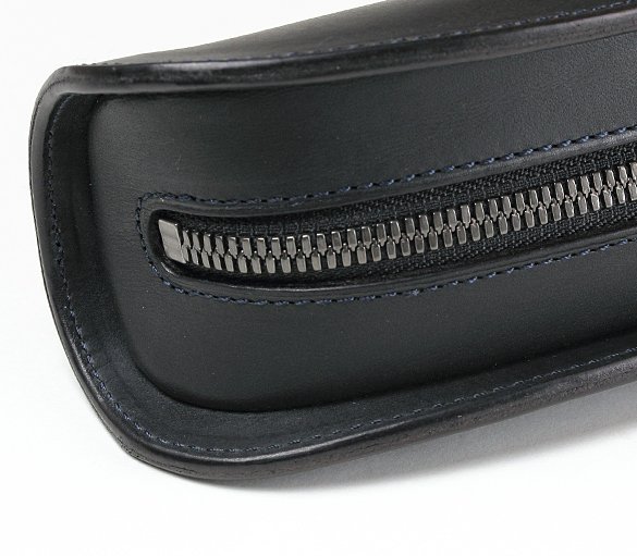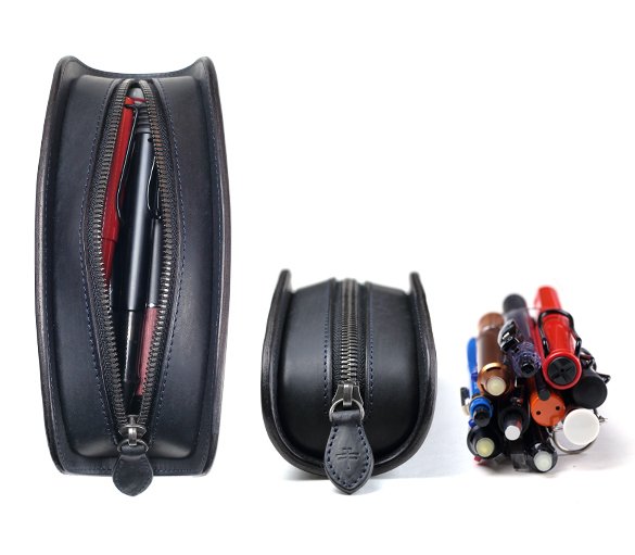 中央に向かって緩やかな弧を描くカーブは、中に入れた消しゴムなどの小物が開閉する際に引っかからないように設計段階で入れた工夫。また、壊れがちなファスナーへの負担を軽減させる目的も担っている。使用しているファスナーにもスムーズな開閉が可能になるエクセラファスナーを採用。噛み合うひとつひとつの金具「務歯(むし)」を磨き削るひと手間が入っており、通常よりも良い滑りを実感出来る。スムーズに動くからこそ負荷がかかりにくく、壊れにくい。またファスナーが端から端までしっかり開き使い勝手が良い。