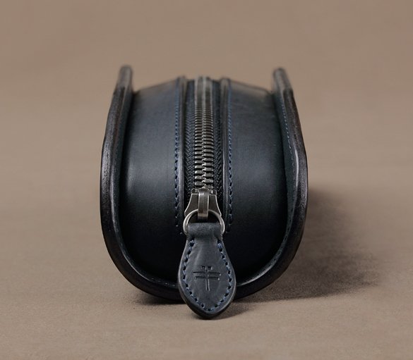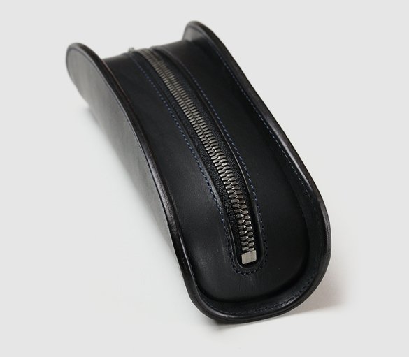 mark_ペンケース_01の作りは手間の連続だ。まず、中心をくり貫いたパーツを接合させる天マチパーツの周囲の革を漉くのだが、革を薄く漉きすぎても厚すぎても綺麗なカーブが描けない上、耐久性にも差がつく。この漉き具合は熟練職人の経験なしには不可能だ。また、この2つのパーツを縫い合わせるのだが、これが更に難易度が高い。曲線の際ギリギリをたった一回の縫製でまとめ、ミシン目が見えないようひっくり返し、最後にこのパーツと表版の革パーツを角のカーブに沿って均等にステッチをかける。まるで鞄を作るような工程だが人目を引く迫力と美しさ、握るとしっかり伝わる革の感触など、このペンケースは男心をくすぐってくれる。