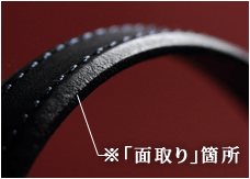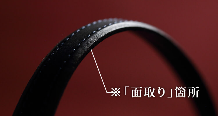 耐久性と使用感が求められるハンドルは、握りやすいようグリップ部分に向かって角度をつけて細くした設計。さらにハンドルの裏面は見た目には分からないがじつは薄く「面取り」(革の断面の角を削る手法)を施し、握った際に革のエッジが手に食い込む痛みを軽減している。この作業のあるなしでは握り心地に大きく違いが出るからだ。ぜひ実際に握って体感していただきたい。