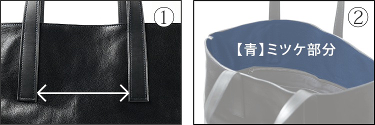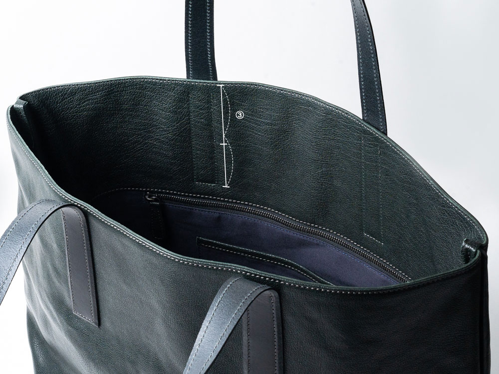 柔らかい革質のP&Dバッファローカーフの大判をこの大きさの鞄で使用するなると、現れやすいのが胴版のシワ。特に重い荷物を入れると根革の部分にハの字のシワが出やすい。このシワを軽減させるために、根革間の距離を力が分散する幅に設計し(※図1)、ミツケ(内装の口元部分)は贅沢に2枚の革(胴版とミツケ)と根革を直接縫製(※図2)。さらにミツケの高さは通常の倍ほど深くした(※図3)。1枚の革だけに根革を縫製すれば、その負荷から当然シワになりやすく、またミツケの高さが浅くてもシワが寄りやすい。シワは見映えに影響する上、上部に力がかかりステッチの傷みにも繋がり兼ねないからこそこだわった点だ。