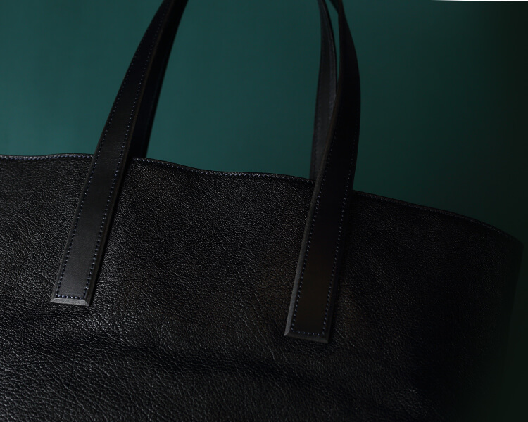 この鞄には2種類の革が使われている。まず、浮き出るシボやギラっとした見た目が印象的なP&Dバッファローカーフ。持ち味である「独特のコシ」を極限まで愉しんでもらうため、また革の表情を存分に味わってもらうために大判を使用。そしてハンドルなどに使用されているもう1つの革、ペコスハード。この革の硬さによって立体的な迫力を生み出した。存在感だけで人の印象に残るトートバッグは必ず仕事の武器となるだろう。