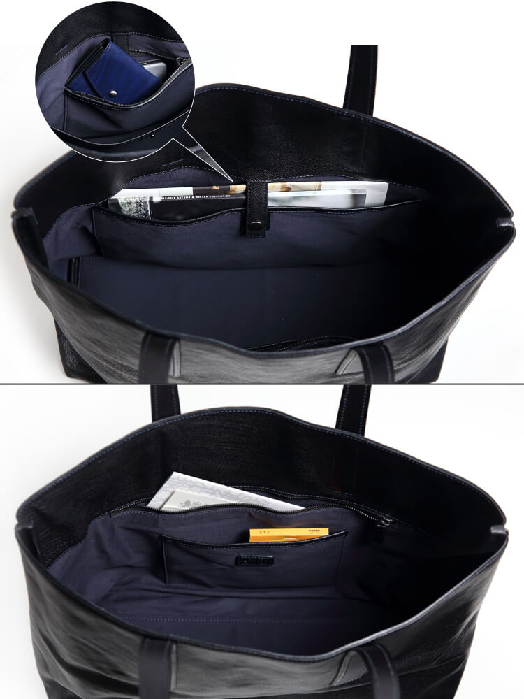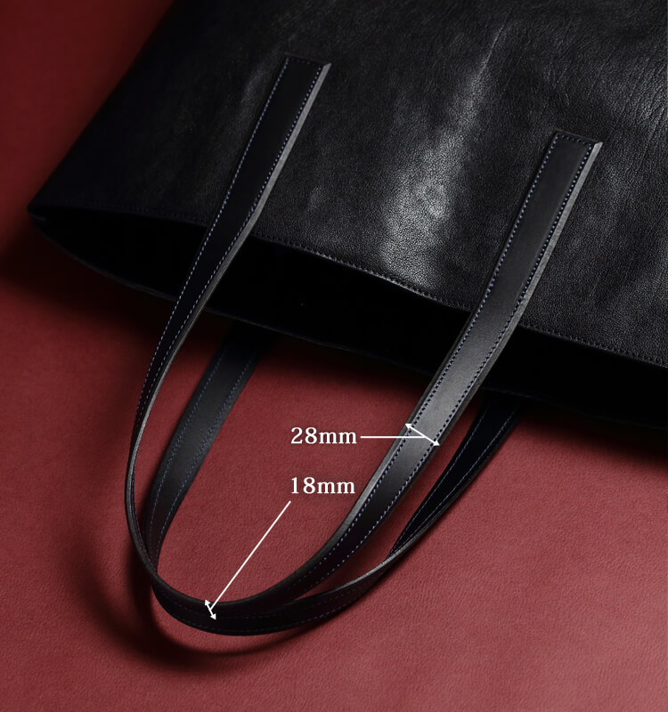 トートバッグの底革には、厚いシールドショルダーレザーを使用。荷物を入れた時もたるまない安定感と、擦れてしまっても厚みがあるため破れることがないことが心強い。
