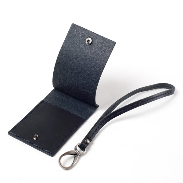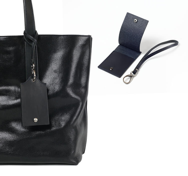 胴版に外ポケットがないこのトートバッグには、ストラップとパスケースが付属する。連結させたストラップとパスケースはハンドルに結ぶことが出来るため、定期を都度出す手間が省け通勤時に便利だ。