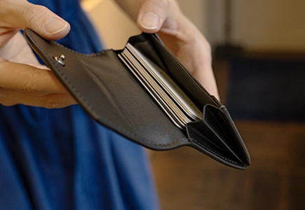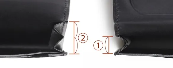 名刺の収納量は最大25枚。そしてマチはW折りを採用している。実は一般的な名刺入れはV折りになっていて、名刺が斜めになってしまうことがあり、またマチの開きもあまり大きくないので収納した名刺を確認しにくい。この現象を軽減させるために編み出されたのがW折りだ。両マチがWに折り込まれているため、納まりが良く、同じサイズのV字の名刺入れと比べると2倍大きく開閉できる。こうしたひと手間は職人の工程を増やしてしまうが使用感に違いが出る妥協できない箇所となる。