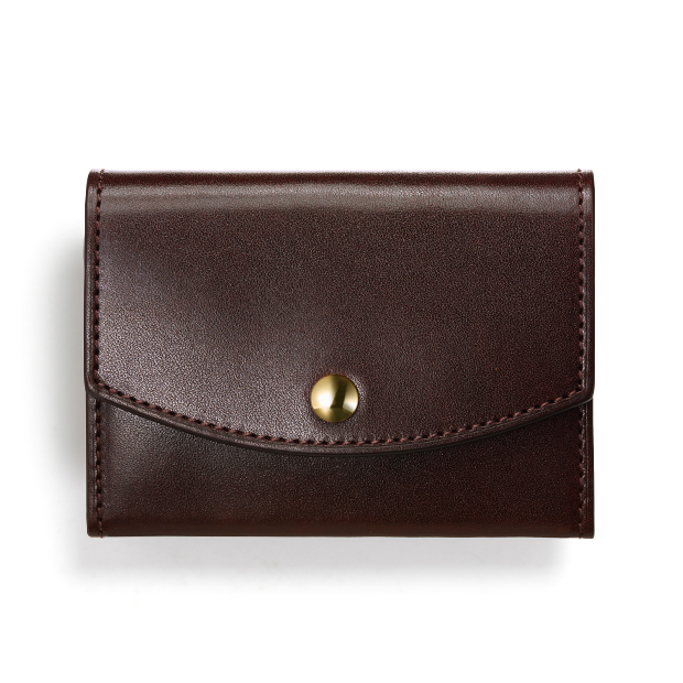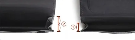 縫製というのはなかなかに奥が深い。それゆえ縫製を見るとその商品の良さが見えてくる。例えば名刺入れをグルっと1周半囲むミシン掛けは非常に難しい。背面を見ると下の方にミシン目を揃えて縫製している箇所があるが、これが名刺入れの前段と中のマチを一緒に縫う出発点となる。縫製方法はこうだ。まず、左右合わせて2回、前段に向かってミシンを掛ける。次に片側の出発点と同じミシン穴から最初は逆方向に縫製し、そのままカブセの曲線を経由して逆側の出発点まで一気に縫う。一回の縫製に見えて、実に3回もミシンを掛けているのだ。そして仕上げにはステッチが二重に掛かる箇所に一度掛けた針穴を狙って上から縫製を施していることも見逃せない。最後の最後、職人の気配りが見え隠れしているはずだ。