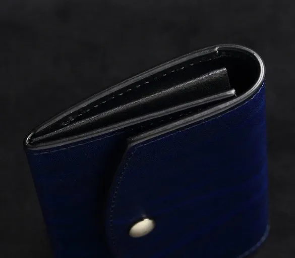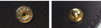 滅多にお目にかかることのない”名刺入れのホック”。アクセントにもなっているこのホックにもAlt81のこだわりが散りばめられている。ホックのメス(受け側)にはドイツ・プリム社製を、オス(突起側)の金具は日本製の真鍮削り出しの挽物を用意。挽物とは金属の塊から削り出して作る方法で、丈夫で綺麗、そして重厚感がある。ホックを留めた際に響く「パチッ」という乾いた高音は真鍮挽物ならではといえる。また、ホックのアタマにも注目して欲しい。ネイビーには黒ニッケルメッキの表面に職人が細かく線を入れ艶を消す「サテー加工」を施したものを、ダークブラウンには眩いゴールドのものをあしらっている。それぞれの革の色に応じて愉しんでいただきたい。
