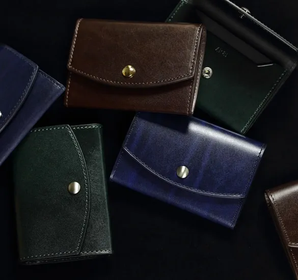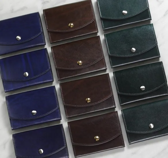 滅多にお目にかかることのない”ホックの名刺入れ”。アクセントにもなっているこのホックにもAlt81のこだわりが散りばめられている。ホックのメス(受け側)にはドイツ・プリム社製を、オス(突起側)の金具は日本製の真鍮削り出しの挽物を用意。挽物とは金属の塊から削り出して作る方法で、丈夫で綺麗、そして重厚感がある。ホックを留めた際に響く「パチッ」という乾いた高音は真鍮挽物ならではといえる。また、ホックのアタマにも注目して欲しい。ネイビーとグリーンには黒ニッケルメッキの表面に職人が細かく線を入れ艶を消す「サテー加工」を施したものを、ダークブラウンには眩いゴールドのものをあしらっている。それぞれの革の色に応じて愉しんでいただきたい。