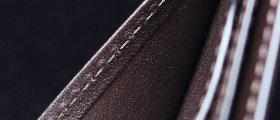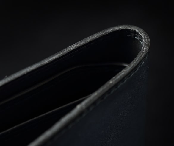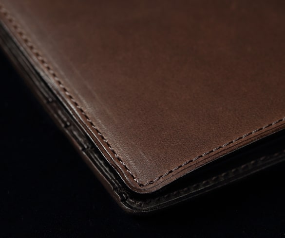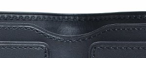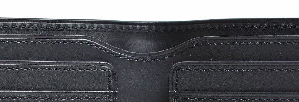カード段はそれぞれ3カ所×2の計6カ所。カードを入れるとわかるがステッチに対してピシッと整然と並ぶ姿は非常に気持ちがいい。また、カード段の縁は革を内側に折り込み、上からステッチを掛けている。こうすることで強度が上がり、さらに縁部分の革の伸びや切れが起こりにくくなる。このピシッと見えるしっかりとした作りは使う人に安心感を与えてくれるだろう。