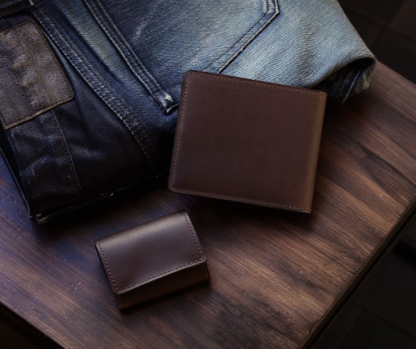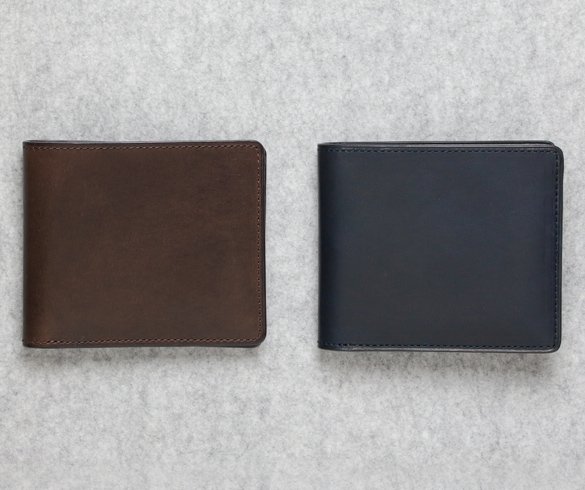 サラッとした質感、濃淡のある表情、薄くやや横長な形、そしてダークブラウンと藍鉄の2色の独特な色合い。お客様から「小銭入れのない二つ折り財布が欲しい」というリクエストを受け生み出されたこの純札入れは、小銭入れを既に持っている人にこそ真価が発揮される。使いやすさ、持ちやすさを追求したこの純札入れにはどんな二つ折り財布も持ちえない個性があり、そして無駄なものは持たないという矜持が備わっている。