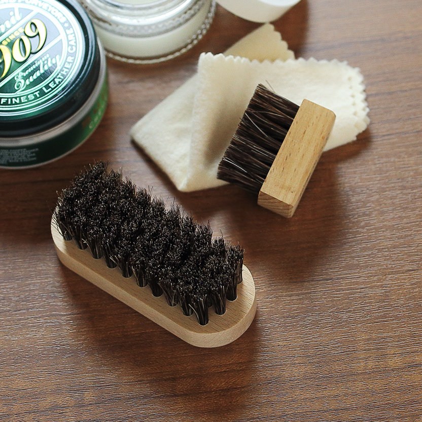 メンテナンスブラシは何より用途が多彩だ。革のギン面に付着した汚れを落としたり、革の凹凸に入った微細な埃を掻き出したり、メンテナンスオイルを使用した際にちょっとした隙間に入り込んでしまったオイルを掻き出したり、逆に革靴に対しては靴クリーム塗り込む際にも使われる。極め付けは定期的にかけることで微細な傷を隠し、革の艶をあげることもできてしまう。革製品のことを考えると持っていた方がいいメンテナンスブラシ。実は皮革専用のブラシを持つことで革製品への愛着も深まる。このことも常備しておいた方がいいと思う理由の1つだ。