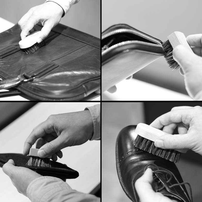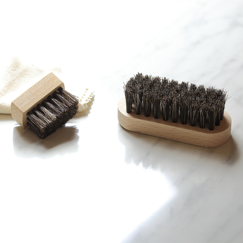 Alt81ではメンテナンスの手始めにまずクロスによる乾拭きと、ブラシによる汚れ落としを推奨している。皮革専用のクリーナーで汚れを落とす場合も、メンテナンスオイルで油分を足す場合も、まずは革の表面を綺麗にしておいた方がいいからだ。クロスによる乾拭きは革の表面に付着した汚れを拭い取り、ブラシは汚れを擦って落とす意味合いがある。その際、クロスは必ずしも専用のものである必要はないが、ブラシはそうはいかない。革製品を1つ以上持っているのなら、ブラシは常備しておいて損はない。