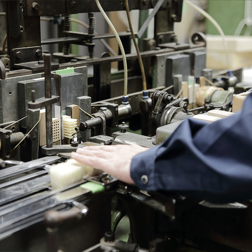 ブラシには様々な毛の種類があるが、汚れ落としや磨きに汎用性の高い馬毛を採用。その馬毛の中でもタテガミよりコシがあり、しなやかな尾の毛を選んでいる。実はこの尾の毛は根元と先端では毛の太さが異なるため、ブラシにする際にはそれらが均等になるように混ぜて整えている。そこから裁断を行い、持ち手の木工に皮革製品に適した長さ20mmになるように植えている。その他にも馬の尾の毛からブラシになるまでにはいくつもの工程を経ていき、そこには経験に裏打ちされた技術が活きている。日本が生み出すブラシの真骨頂を是非、体験していただきたい。