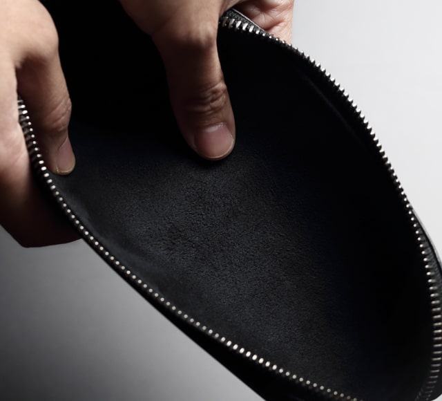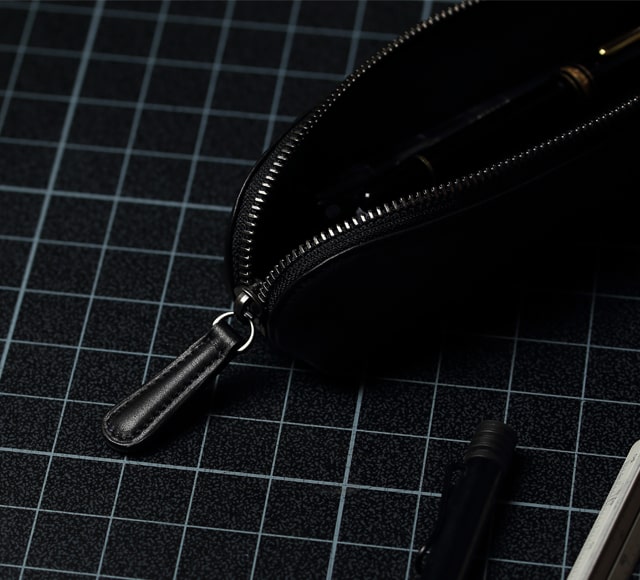 ペンケースの内装にこれほどまでに触れていて気持ちのよい素材を使っているものはあっただろうか。起毛素材であるボンセーヌを内装全面に使用しており、ペンの出し入れで触れるたび、気持ちよく、高級感を感じとれる。勿論、この素材は高級感だけではない。擦れなどにも強いため耐久性も高く、色も黒いためにペンケースの中に見られがちな汚れが目立ちにくい。長期間にわたり、綺麗に使用していただけることだろう。