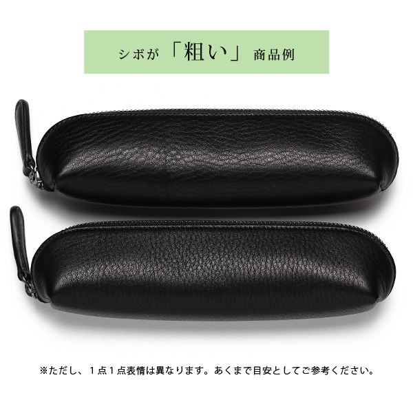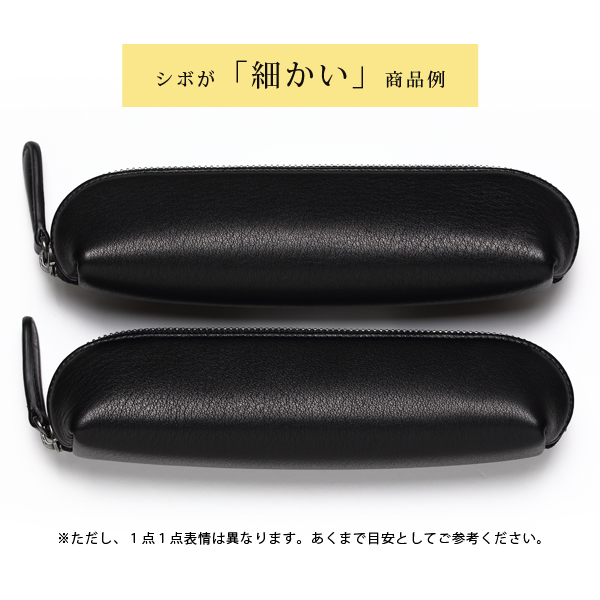 シルキーカーフは実に表情が豊かな革である。シボの粗いものは細かいものよりもふっくらとした質感になり、その凹凸が個性を強く印象付ける。逆にシボの細かいものは粗いものよりも手触りがサラサラとしていて、肌ざわりが滑らかになっている。そのどちらにもこの革にしか存在しない魅力が満ちていていて、店頭でもお客様を悩ませている。1点1点表情が異なるので、気になる方はご注文の際に表情選択サービスをご利用いただきたい。